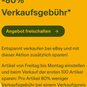 - 80% weniger Verkaufsgebühr bei einem Verkaufspreis ab 50 €: https://pages.ebay.de/promos/2021/1002030/private/minus80SP50.html