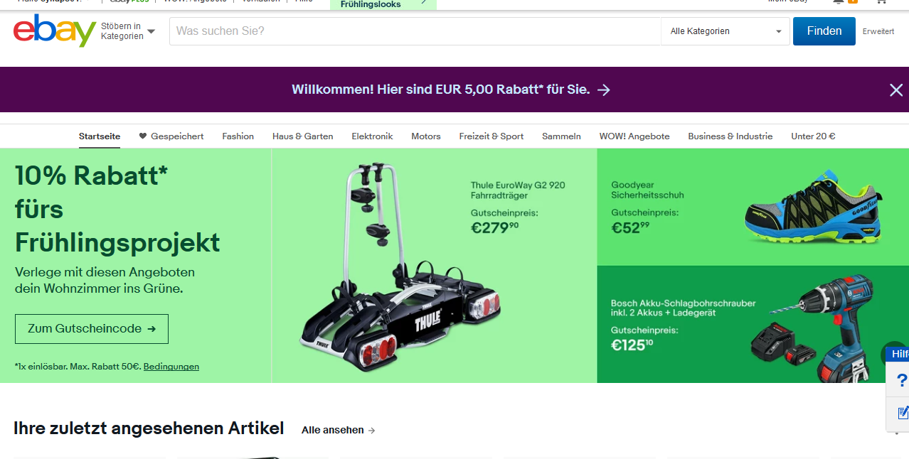 Ebay 5€ Rabatt bei 10€ Mindestbestellwert .Gültig bis 17.04.19 23:59 ( Für Ausgewählte Mitglieder, einloggen und schauen ob der Banner bei euch erscheint )