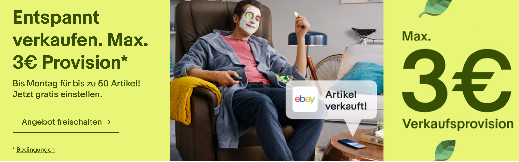 Bei ebay könnt ihr gerade wieder für nur 1€ Verkaufsprovision verkaufen. Die Aktion läuft bis 18.04. und ist bis zu 5x einlösbar.