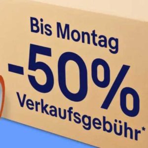 Bedingungen: „Bis Montag: Exklusiv für eingeladene private Verkäufer. Bis zu 100 Artikel von Freitag bis Montag kostenlos einstellen und bei Verkauf jeweils nur die Hälfte der regulären Verkaufsgebühr zahlen. Weitere Gebühren u.a. für Zusatzoptionen und PayPal können anfallen. Jetzt freischalten!“