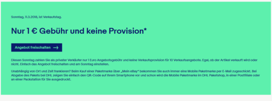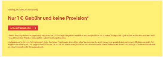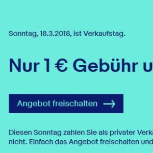 In sieben Tagen ist es wieder soweit! eBay startet wieder den Verkaufstag am Sonntag, den 13.05.2018. Diesen Sonntag zahlen Sie als privater Verkäufer nur 1 Euro Angebotsgebühr und keine Verkaufsprovision für 10 Verkaufsangebote. Egal, ob der Artikel verkauft wird oder nicht. Einfach das Angebot freischalten und am Sonntag einstellen. Die Bedingungen lauten wie folgt: Wer kann die Preisaktion benutzen?