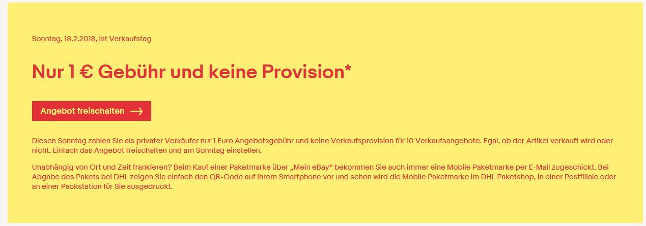 Gast (Gast) 17.02.2018, 09:31 #Kurze Erinnerung: Morgen ist es wieder mal soweit: Nur 1 Euro Gebühr und sonst nix – eBay Verkaufs-Sonntag 🙂