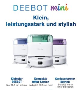 - 【Ultrakompakter DEEBOT】Der DEEBOT Mini gleitet mit seiner Breite von nur 28,6 cm geschickt durch enge Bereiche. Ausgestattet mit fortschrittlichen Kantenabstandssensoren, LDS-Radar und nach vorne gerichteten Lasern, kartiert er meisterhaft die beste Route für eine umfassende Reinigung und vermeidet gleichzeitig Hindernisse. Mit seiner hohen Reinigungsabdeckung stellt der DEEBOT Mini sicher, dass auch in kleinen Wohnungen kein Schmutz zurückbleibt. Im Vergleich zu herkömmlichen Modellen erreicht er wesentlich mehr Stellen und reinigt gründlicher sowie effizienter, sodass in jedem Raum eine maximale Reinigungsabdeckung erreicht wird.