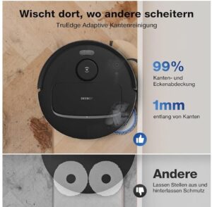 - Ausgestattet mit der TruEdge-Technologie zeichnet sich der DEEBOT N30 PRO OMNI durch eine beispiellose Präzision beim Reinigen von Kanten und Ecken aus. Durch den Einsatz eines schwebenden Arms und fortschrittlicher Algorithmen erreicht er eine Genauigkeit von 1 mm und verbessert die Abdeckung in schwer erreichbaren Bereichen um 99 %, sodass kein Fleck unberührt bleibt. Außerdem kann er den Mopp automatisch anheben, um Teppiche effektiv zu bearbeiten, Kreuzkontaminationen zu verhindern und ein problemloses Reinigungserlebnis zu gewährleisten.