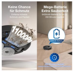 - Dank 6.400 mAh-Akku mit bis zu 350 Minuten Laufzeit ist der DEEBOT T30S PRO perfekt für große Häuser geeignet. Durch das Schnellladen kann der DEEBOT die Reinigung schnell wieder aufnehmen, da er 40 % schneller auflädt als die Vorgängerversion.