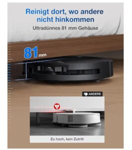 - 【Ultradünne 81 mm reinigen unter Möbeln】 Der DEEBOT T50 verfügt über ein ultradünnes 81-mm-Design, das durch ein vollständig in das Gehäuse eingebettetes dToF-LiDAR-Modul ermöglicht wird. Damit kann er problemos unter niedrigen Möbel und in schwer erreichbaren Bereichen reinigen, wodurch die Reinigungsabdeckung und -effizienz verbessert wird.