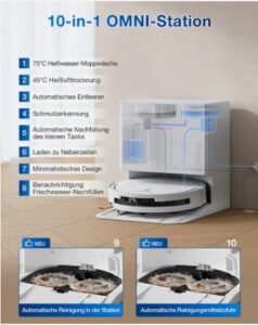 - 【OMNI-Station mit automatischer Reinigungsmittelzugabe】 Die All-in-One-OMNI-Station bietet erweiterte Funktionen, darunter automatisches Entleeren, Heißlufttrocknen bei 45 °C und automatische Reinigungsmittelzugabe. Durch die bidirektionalen Schabern und das Wischmoppwaschen mit 40-75 °C heißem Wasser reinigt sie sowohl den Mopp als auch die Basis durch automatische Selbstreinigung.