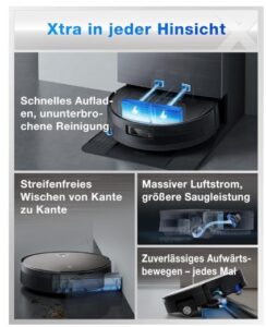 - 【Verbesserte, innovative OMNI-Station】Die verbesserte OMNI-Station sorgt für reibungslose Wartung: Temperaturgesteuerte Moppwäsche 2.0 (40–75 °C): Passt Wärme und Waschzyklen an den Verschmutzungsgrad an, um Dreck zu lösen und Bakterien abzutöten. Heißlufttrocknung bei 63 °C: Beseitigt Gerüche und Mikroorganismen zu 99,9 % und trocknet die Wischmopps in 2 Stunden. Automatische Leerung des Staubbehälters und 150 Tage wartungsfreie Reinigungswanne: 90 Tage ohne manuelle Entleerung und minimale Reinigung der Wanne (1–2 Mal/Jahr).