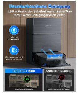- 【PowerBooster-Technologie】Der ECOVACS X11 ermöglicht einen intelligenten Dauerbetrieb für eine unterbrechungsfreie Reinigung von bis zu 1.000m² pro Zyklus, selbst bei maximalem Einstellungen. So gewährleistet er gleichbleibende Leistung über große Flächen hinweg–ganz ohne manuelles Eingreifen. Die revolutionäre PowerBoost-Technologie sorgt mit ultraschnellen Nachladen des Akkus für eine unterbrechungsfreie Reinigung und ein völlig neues Reinigungserlebnis. Der selbstoptimierende Algorithmus priorisiert einen vollständigen Reinigungsabschluss, indem er dynamisch Energie spart. Die PowerBoost-Technologie stellt während der routinemäßigen Reinigungsintervalle 6% Akku in 3 Minuten wieder her.