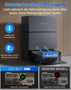- Der ECOVACS X11 ermöglicht einen intelligenten Dauerbetrieb für eine unterbrechungsfreie Reinigung von bis zu 1.000m² pro Zyklus, selbst bei maximalem Einstellungen. So gewährleistet er gleichbleibende Leistung über große Flächen hinweg–ganz ohne manuelles Eingreifen. Die revolutionäre PowerBoost-Technologie sorgt mit ultraschnellen Nachladen des Akkus für eine unterbrechungsfreie Reinigung und ein völlig neues Reinigungserlebnis. Der selbstoptimierende Algorithmus priorisiert einen vollständigen Reinigungsabschluss, indem er dynamisch Energie spart. Die PowerBoost-Technologie stellt während der routinemäßigen Reinigungsintervalle 6% Akku in 3 Minuten wieder her.