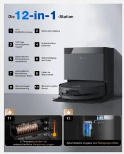 - 【Verbesserte OMNI-Station】 Die verbesserte OMNI Station mit Wischmopp-Reinigung nutzt 75°C heißes Wasser, um Schmutz und Flecken vom Wischmopp effektiv zu entfernen und verhindert gleichzeitig spätere Neuverschmutzungen. Das Trocknungssystem arbeitet mit 63°C heißer Luft und dreht die Wischwalze um 360° während der Trocknung, wobei die heiße Luft direkt aus kurzer Entfernung aufgeblasen wird. Es dauert nur 2 Stunden, um den Wischmopp vollständig zu trocknen und damit schlechte Gerüche zu vermeiden. Die fortschrittliche Wischmopp-Reinigungsschale ermöglicht eine wartungsfreie Zeit von 150 Tagen.