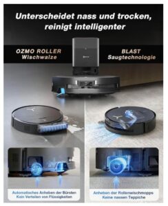 - 【BLAST Technologie und 16.600 Pa Saugkraft】DEEBOT X9 PRO OMNI revolutioniert die Haushaltsreinigung mit der BLAST Technologie, die eine extrem hohe Saugkraft von 16.600 Pa und mit einem großen Luftstrom von 16,3 l/s (49 % mehr als herkömmliche Saugroboter*) verbindet. So werden festsitzender Staub, Tierhaare und große Schmutzpartikel mühelos aufgenommen (100 % bei Schmutzpartikeln in der Größe von Frühstücksflocken). Angetrieben wird der X9 PRO OMNI erstmals mit Batteriezellen aus der Klasse für Elektrofahrzeuge (2,4 Mal längere Laufzeit) und damit entfernt er 137,6 % mehr Staub aus Teppichen und nimmt feinste Partikel auf – ideal für Teppiche und Hartböden. * (In ECOVACS Laboren getestet)