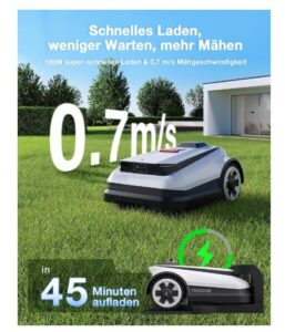 - Superschnelles Aufladen in 45 min: Der GOAT ist mit einer langlebigen Batterie ausgestattet, die ein superschnelles Aufladen ermöglicht und die Standzeit minimiert. Der Roboter kann 500 m² Fläche in nur 2 Stunden mähen, einschließlich Nachladezeit.