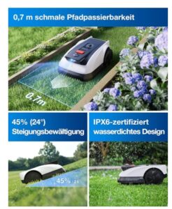 - Navigiert problemlos auf 0,7 Meter breiten Wegen. Bewältigt Steigungen von bis zu 45%: Der GOAT verfügt über ultrakompakte Abmessungen und ist nur 40cm breit, somit passt er mühelos durch Wege mit einer Breite von nur 70cm, ohne steckenzubleiben. Er bewältigt zudem Steigungen bis zu 45% und Hindernisse mit einer Höhe von bis zu 3cm. Zusätzlich ist die Schnitthöhe einstellbar von 3cm bis 8cm, um auch unterschiedlichste Grasarten mähen zu können, er besitzt damit eine außergewöhnliche Anpassungsfähigkeit an unterschiedliche Außenumgebungen.