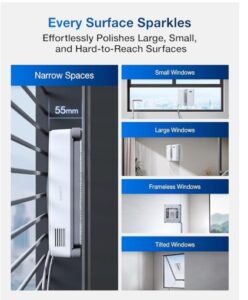 - 【Schlankes & kompaktes Design】Durch sein einzigartig kleines und dünnes Design kann der WINBOT MINI neben bodentiefen, rahmenlosen oder kippbaren Fenstern nun auch Bereichen abdecken, die größere Fensterputzroboter bislang nicht erreichen konnten. Der WINBOT MINI kann sehr kleine Fenster mit einer einzigen Seitenlänge von weniger als 30 cm reinigen und auch unterhalb von Fenstergriffen (der Abstand zwischen Griff und Glas beträgt etwa 50 – 80 mm).