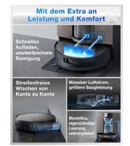 - 【Verbesserte BLAST-Lösung und 19.500 Pa Saugleistung】Der Roboter überzeugt mit einem 100-W-Motor mit hohem Drehmoment und verfügt über 45% größere Gebläseblätter in einer niederohmigen Struktur. Mit einer Batteriezelle wie sie auch in Elektrofahrzeugen verwendet wird, liefert er einen bisher unerreichten Luftstrom von 18 l/s und eine Saugleistung von bis zu 19.500 Pa. Dies führt zu einer 140%igen Steigerung der Feinstaubentfernung und einer 262%igen Steigerung der Haarentfernung auf Teppichen und einer Aufnahmerate von 100 % bei großen Schmutzpartikeln auf Hartböden und Teppichen.