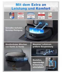 - 【PowerBooster-Technologie】Der ECOVACS X11 ermöglicht einen intelligenten Dauerbetrieb für eine unterbrechungsfreie Reinigung von bis zu 1.000m² pro Zyklus, selbst bei maximalem Einstellungen. So gewährleistet er gleichbleibende Leistung über große Flächen hinweg–ganz ohne manuelles Eingreifen. Die revolutionäre PowerBoost-Technologie sorgt mit ultraschnellen Nachladen des Akkus für eine unterbrechungsfreie Reinigung und ein völlig neues Reinigungserlebnis. Der selbstoptimierende Algorithmus priorisiert einen vollständigen Reinigungsabschluss, indem er dynamisch Energie spart. Die PowerBoost-Technologie stellt während der routinemäßigen Reinigungsintervalle 6% Akku in 3 Minuten wieder her.