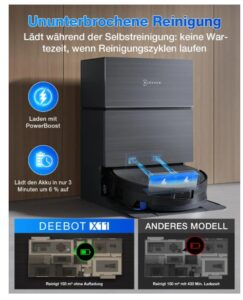 - 【PowerBooster-Technologie】Der ECOVACS X11 PRO OMNI ermöglicht einen intelligenten Dauerbetrieb für eine unterbrechungsfreie Reinigung von bis zu 1.000m² pro Zyklus, selbst bei maximalem Einstellungen. Die revolutionäre PowerBoost-Technologie sorgt mit ultraschnellen Nachladen des Akkus für eine unterbrechungsfreie Reinigung und ein völlig neues Reinigungserlebnis. Der selbstoptimierende Algorithmus priorisiert einen vollständigen Reinigungsabschluss, indem er dynamisch Energie spart. Die PowerBoost-Technologie stellt während der routinemäßigen Reinigungsintervalle 6% Akku in 3 Minuten wieder her.