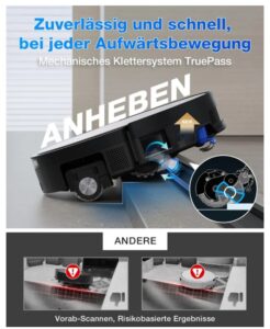 - 【Verbesserte BLAST-Lösung und 19.500 Pa Saugleistung】Der Roboter überzeugt mit einem 100-W-Motor mit hohem Drehmoment und verfügt über 45% größere Gebläseblätter in einer niederohmigen Struktur. Mit einer Batteriezelle wie sie auch in Elektrofahrzeugen verwendet wird, liefert er einen bisher unerreichten Luftstrom von 18 l/s und eine Saugleistung von bis zu 19.500 Pa. Dies führt zu einer 140%igen Steigerung der Feinstaubentfernung und einer 262%igen Steigerung der Haarentfernung auf Teppichen und einer Aufnahmerate von 100 % bei großen Schmutzpartikeln auf Hartböden und Teppichen.