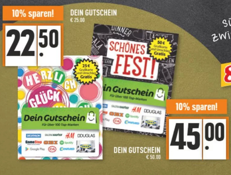 Bei Edeka bekommt man ab dem 11. November 10% Rabatt auf die 25€ & 50€ Gutscheinkarten von DeinGutschein.de.