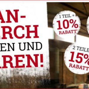 Die Aktion gilt nur heute und nur online auf das ausgewählte Sortiment. Nicht mit anderen Aktionen kombinierbar. Der jeweilige Rabatt (10%, 15% oder 20%) wird automatisch im Bestellprozess abgezogen. Nur solange der Vorrat reicht.
