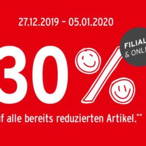 **Der Rabatt gilt vom 27.12.2019 bis 05.01.2020 für alle bereits reduzierten Artikel. Gültig im Online Shop, in der App und in allen Filialen von Ernsting’s family. Online Exklusiv Artikel sind in allen Filialen von Ernsting’s family bestellbar. Der Rabatt gilt nicht für Gutscheine und Versandkosten. Preisgebundene Bücher sind von der Aktion ausgeschlossen. Internetpakete können nicht in der Filiale rabattiert werden. Nicht kombinierbar mit anderen (Aktions-)Rabatten. Der Rabatt wird automatisch im Warenkorb abgezogen.