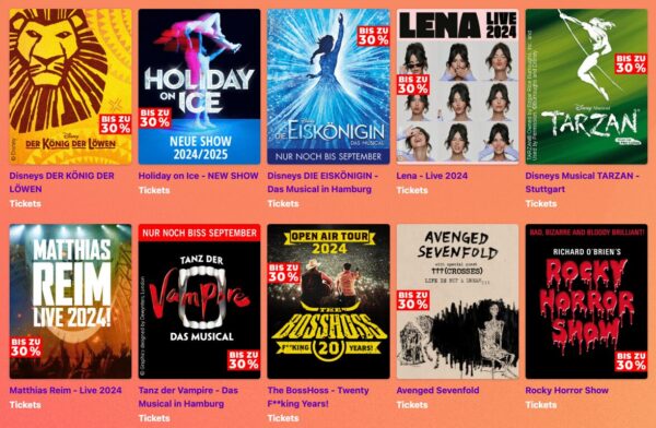 Auf Klassiker wie z.B. Disneys Der König der Löwen, Tanz der Vampire, Holiday on Ice oder Disneys Musical Tarzan gibt es bis zu 30% Rabatt. Auf Tickets für DJ Ötzi präsentiert Mountain Mania gibt es bis zu 40% Rabatt und beim Pietro Lombardi Konzert sogar bis zu 50% Rabatt. Vielleicht werdet ihr ja auch fündig!