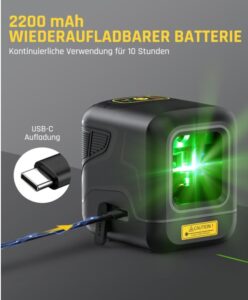- Wiederaufladbare Batterie & 10 Stunden Laufzeit: Der Fanttik D2 Kreuzlinienlaser verfügt über einen eingebauten 2200 mAh wiederaufladbaren Akku, der mit einer einzigen Ladung bis zu 10 Stunden kontinuierliche Laufzeit bietet. Der Akku mit hoher Kapazität kann über 500 Mal wiederaufgeladen werden. Dies eliminiert die Notwendigkeit häufiger Batteriewechsel und spart Ihnen Geld für Einwegbatterien