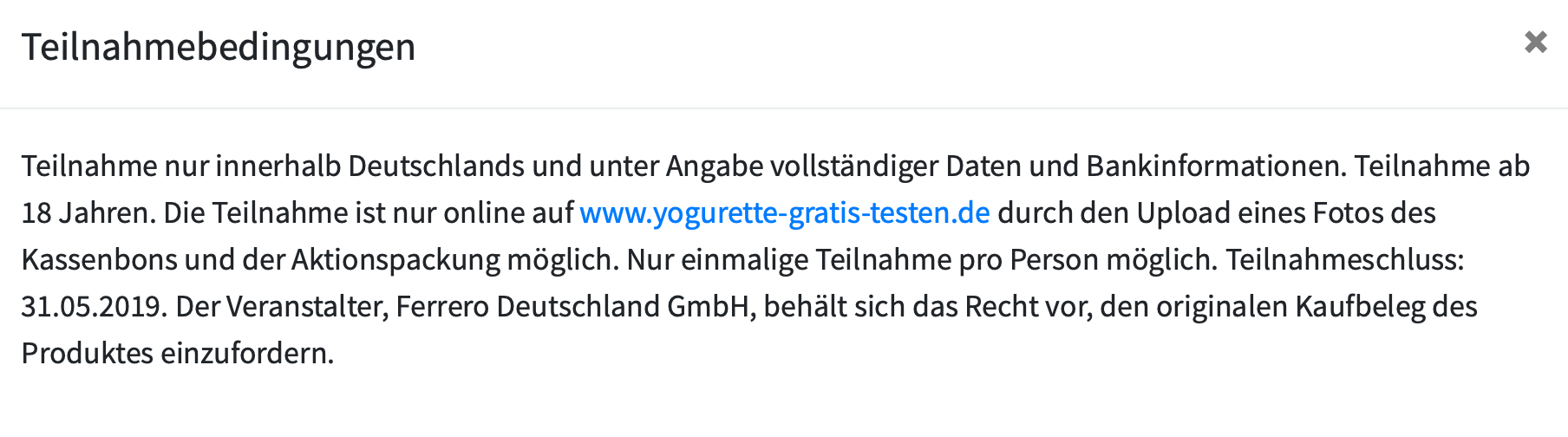 - Um an der Aktion teilzunehmen, kannst du bis zum 31.05.2019 eine Aktionspackung kaufen und den dazugehörigen Kassenbon und Aktionspackung auf yogurette-gratis-testen.de hochladen