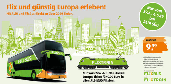 Nur vom 29.4.–4.5. das FlixBus Europa-Ticket für 9,99 Euro in allen ALDI SÜD Filialen.
