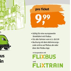- Der Ticketcode kann in der Zeit vom 29.4. bis 28.5. auf flixbus.de, über die FlixBus App und in teilnehmenden Reisebüros eingelöst werden.