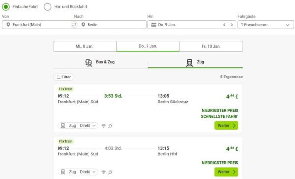 - Frankfurt nach Berlin am 09.01.2025 ab 4,44€