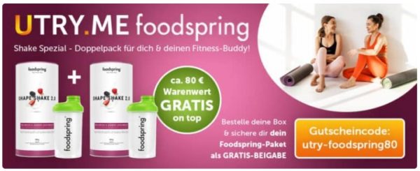 Wenn ihr schon jetzt wisst, dass ihr im neuen Jahr abnehmen oder einfach ein wenig fitter werden wollt, dann dürfte euch die derzeitige Zugabe bei UTRY.ME gefallen: Mit dem Gutscheincode utry-foodspring80 erhaltet ihr nämlich ein ganzes foodspring-Paket zur Bestellung geschenkt. Der Inhalt: