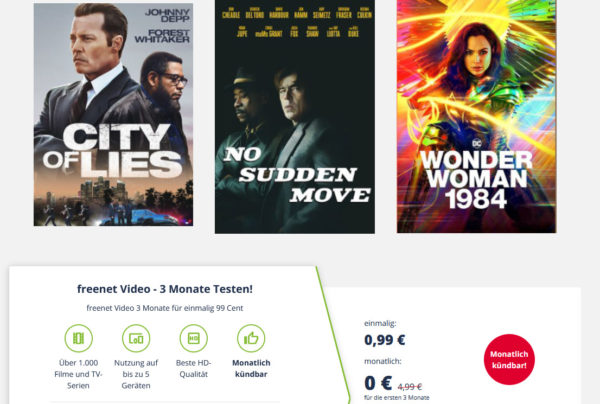 Aktuell gibt es bei freenet Video ein Angebot für 0,99€ für 3 Monate. Sonst kostet der Dienst 4,99€ mtl. und ihr könnt euch Wonder Women 1984 für einen schmalen Taler ansehen.