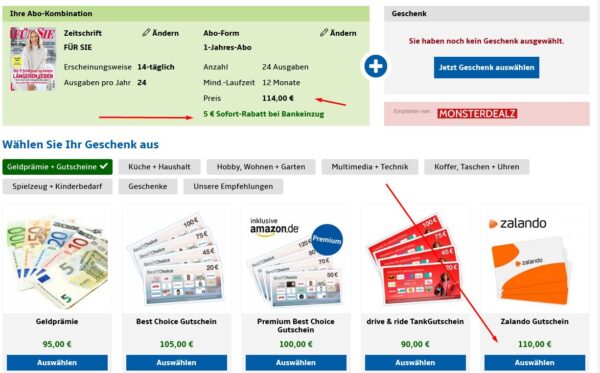 - Das Geschenk kann eine Geldprämie sein oder ein Gutschein (z.B. 110 € von Zalando oder Douglas)