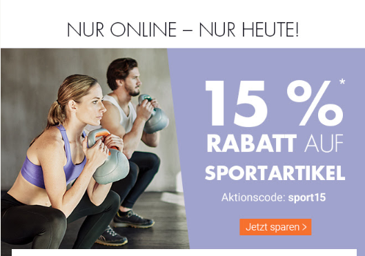 Bei Galeria-Kaufhof bekommt ihr heute als Tagesdeal 15% Rabatt auf Sportartikel.