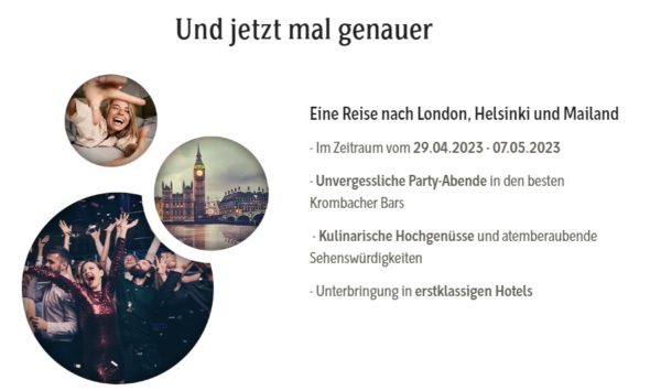 Bei Krombacher habt ihr nun die Chance auf den folgenden Gewinn, die Big City European Bar Tour, wo ihr die beliebten Krombacher Bars in London, Helsinki und Mailand besuchen könnt.