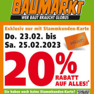 Beim GLOBUS Baumarkt vor Ort gibt es vom 23.2.-25.2.2023 20% Rabatt auf alles für Kund*innen mit Stammkunden-Karte – diese muss vorgelegt werden!Ausgenommen ist die Werbeware jeweils und sonstige Artikelgruppen sowie der Online-Shop.Die Stammkunden-Karte kann kurzfristig erhalten werden. Hierzu ist eine Registrierung notwendig. Mit der Stammkunden-Karte kann man zudem bei Verwendung innerhalb von 12 Monaten bis zu 10% Bonus erhalten.