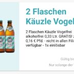 Bei Logo gibt es ab Montag bis 28.03.2026 in der App zwei Flaschen Käuzle Vogelfrei Alkoholfrei 0,33l gratis.