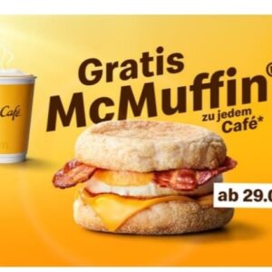 Erhalte ab dem 29.04.2024 einen GRATIS McMuffin deiner Wahl zu jedem Café, Cappuccino oder Latte Macchiato in Regular oder Grande.