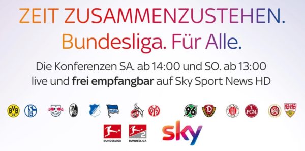 Aufgrund der angesetzten Geisterspiele im Rahmen der Corona-Krise hat sich Sky dazu entschlossen, die Konferenz der 1. und 2. Bundesliga für alle freizuschalten. Unter dem Motto „ZEIT ZUSAMMENZUSTEHEN. BUNDESLIGA. FÜR ALLE!“ könnt ihr die Konferenzen live auf Sky Sport News HD, der Sky Webseite oder der Sky-Sport-App verfolgen. 🙂 Vorerst geplant sind die Übertragungen für den aktuellen und nächsten Spieltag.