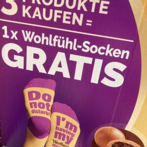 Wenn man 3 Produkte von Werthers Original im Aktionszeitraum 1.8.-31.12.2025 kauft, den Kassenzettel unter http://www.werthers-original.de hochlädt, gibt es gratis Socken als Zugabe per Post dazu.