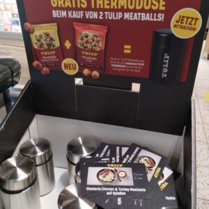 Wer 2 Packungen Tulip Meatballs kauft, kann gratiis eine Thermodose mitnehmen – solange der Vorrat reicht.