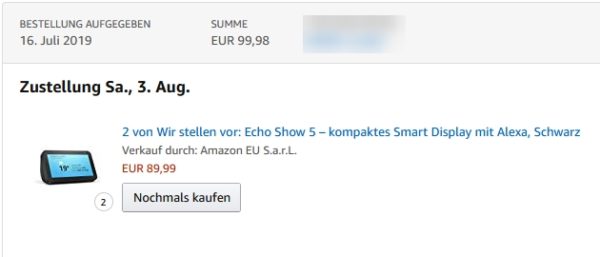 16.07.2019, 17:17 #Jetzt habe ich 2 Echo Show 5 statt 1. ^^ Aber vielleicht ist Amazon ja auch arschig und storniert? Ich glaube es zwar nicht aber man weiß ja nie…
