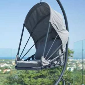 Nicht nur ein Blickfang, sondern auch äußerst praktisch, ist dieser Hängesessel. Er verfügt über Abmessungen von ungefähr 100 x 187 x 124 cm (Breite x Höhe x Tiefe) und ist aus robustem Metall gefertigt. Die Sitz- und Rückenkissen in Grau sind nicht nur stilvoll, sondern auch äußerst komfortabel.