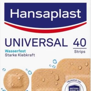 - Lieferumfang & Details – Hansaplast Universal Pflaster, 40 Strips in 4 unterschiedlichen Größen, wasser- und schmutzabweisend.