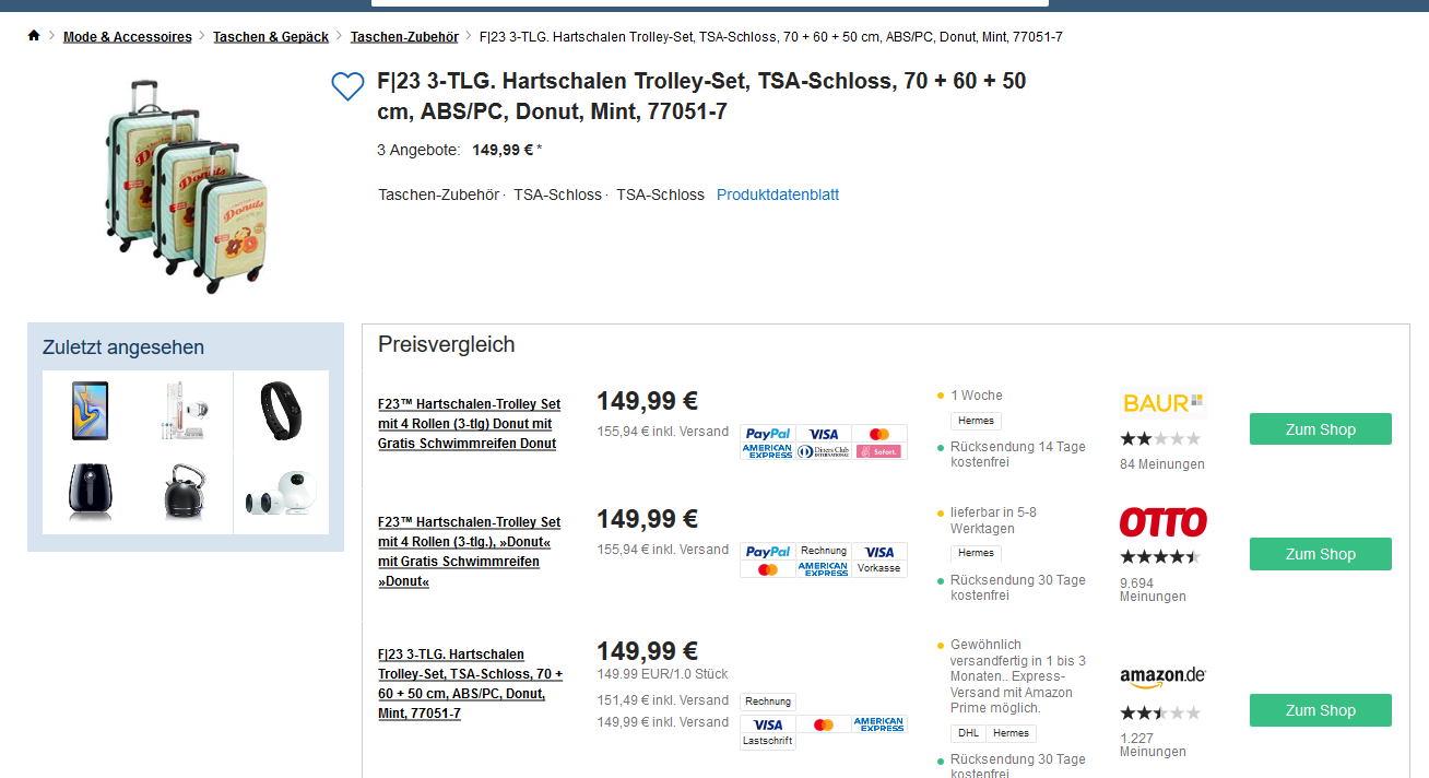Bei DealClub erhaltet ihr Hartschalen Trolley-Set, TSA-Schloss, 70 + 60 + 50 cm, ABS/PC, Donut, Mint, 77051-7 F|23 3-TLG. für 64,90 inkl.Versand PVG liegt bei satten 149,99 Euro.
