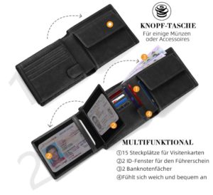 - Brieftaschengröße: 12,5 * 10 * 2 cm. Unsere Herrenbrieftasche im Trifold-Stil mit 15 x Kartenfächern, Karten ganz einfach, 2 x Banknotenfächern in voller Länge, 2 x durchsichtiges Fenster für Personalausweis oder Führerschein. Mit viel Platz für viele Karten und Geldscheine.