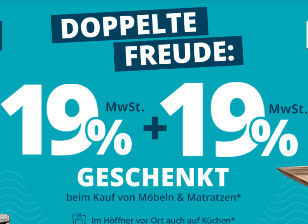 Höffner schenkt Ihnen: 50€ ab 250€ Einkaufswert, 100€ ab 500€ Einkaufswert, 200€ ab 1.000€ Einkaufswert, 500€ ab 2.000€ Einkaufswert beim Kauf von Möbeln und Matratzen. Ausgenommen von dieser Rabattaktion sind alle Artikel aus der Elektroabteilung, Gutscheine und Bücher. Alle an der Aktion teilnehmenden Artikel im Online-Shop und in den Prospektbeilagen werden im Aktionszeitraum bereits reduziert angezeigt und gekennzeichnet. Aktuelle Prospekte sind unter http://www.hoeffner.de einzusehen.Weiterhin ausgenommen sind bereits reduzierte Möbel und Matratzen oder als Dauertiefpreis gekennzeichnete Artikel. Nicht mit anderen Rabattaktionen kombinierbar. Kundenkartenrabatt ist bereits enthalten. Barauszahlungen nicht möglich. Pro Haushalt und Einkauf nur ein Gutschein einlösbar. Gültig für Neukäufe. Gültig bis 23.12.18.
