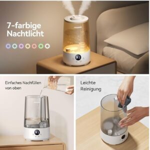 - [Einzigartiger SilentSpray & Ungestörter Schlaf] Der Raumluftbefeuchter verfügt über einen Schlafmodus mit Displayabschaltung und die exklusive SilentSpray-Technologie, um Geräusche von weniger als 16 dB zu gewährleisten. Auch Babys, die geräuschempfindlich sind, können die ganze Nacht tief und fest schlafen.